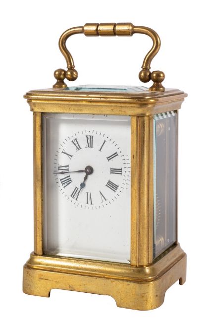 Diette-Hour, Paris, a miniature carriage clock: the eight-day duration, timepiece movement having a platform cylinder escapement with the backplate stamped with the initials DH for the makers Diette-Hour, the white enamel dial with black Roman numerals and blued steel spade hands, the gilt-brass Corniche case with handle, height 8cm handle down, 9.5cm handle up.* Biography Charles Hour had premises at 7, Rue Saint-Anastase, Paris, being an important maker who was a witness at the wedding of Raoul-Alfred Baveux in 1899, the successor with his brother to Alfred Baveux when they continued to supply carriage clock movements to the famed Henri Jacot workshop as Baveux Frères. Hour teamed up with Diette at the end of the 19th century with their trademark being the initials DH, with additional workshops at Marche des Enfants Rouge.