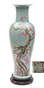 A large Chinese famille rose baluster vase: finely enamelled with four birds perched on a gnarled blossoming prunus tree on a pale turquoise ground, the tree trunk with four apocryphal six-character Kangxi seal marks, the base with underglaze blue double circles, Republic/20th century, 62cm and wood stand.* Provenance Herbert Sutton [1880-1946] and thence by family descent.Herbert Sutton was born at Thame, Oxfordshire and educated in France, Germany and Grantham, England. At eighteen years of age he joined his father who was in business in Hong Kong. After two years he joined a firm of silk traders at Canton and became it's head during twenty five years of service. For three successive years he was chairman of the Municipal Council of the British Concession at Canton and had to shoulder considerable responsibility during the 1914-18 war. One of his tasks was to close a German bank when China entered the war on the side of the allies. He retired to Great Yarmouth, Norfolk in the late 1920s and served as a member of the Town Council for sixteen years.