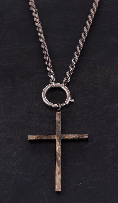 A silver crucifix on chain: the crucifix hallmarked for silver, the rope link chain marked for silver, length 46cm.