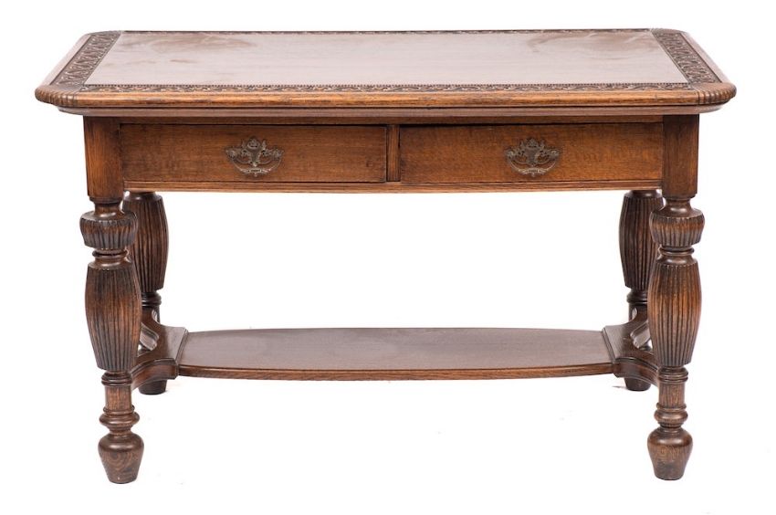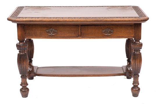 A carved oak hall table in Italian 17th century taste, early 20th century,: the rectangular top with scrolling foliate carved border in recessed low relief; one long side with two drawers with metal swing handles; on knopped, waisted and reeded legs united by a shaped undershelf; 74cm high, 123cm long, 72cm wide