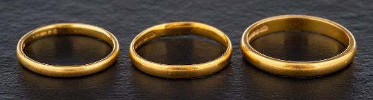 Three 22ct gold bands,: ring sizes L1/2, M and R, total weight ca. 8.4gms.