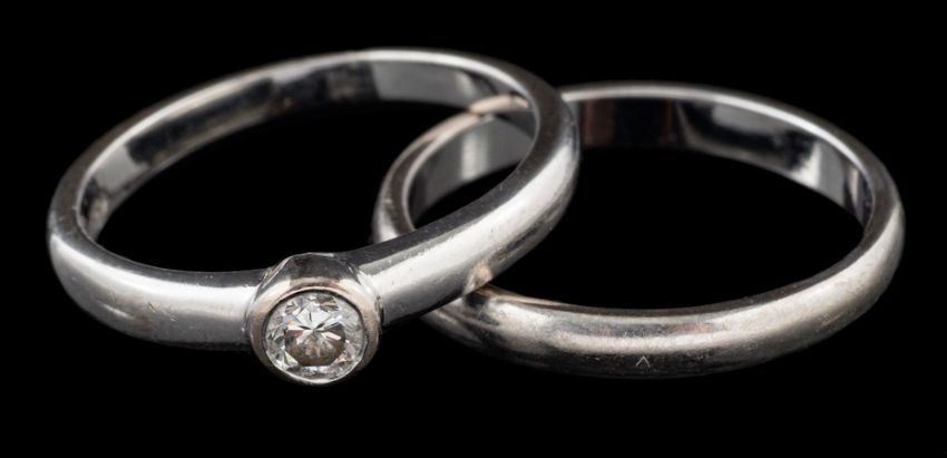 An 18 carat gold diamond ring,: the brilliant cut diamond, estimated to weigh 0.13 carats, in a collet setting, stamped 750, ring size I 1/2; and an 18 carat gold band, ring size I 1/2.