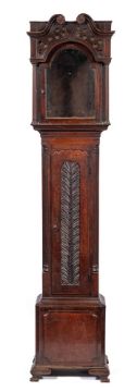 A carved oak longcase case: to take a break-arch eleven-inch dial, with fluted quartered columns to the trunk and carved leaf decoration to the door, the hood having a swan-neck pediment and fluted columns, the base with a raised panel, canted corners and standing on bracket feet, height 212cm.