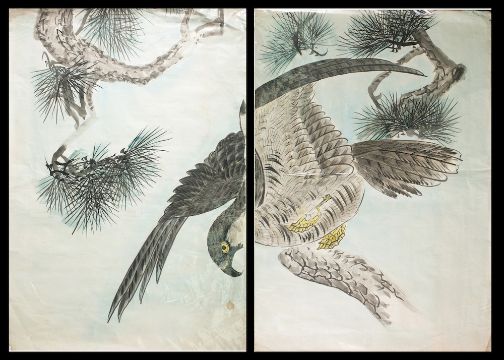 Two Japanese woodblock prints in two parts: depicting eagles flying over pine trees each 94 x 130cm (2)