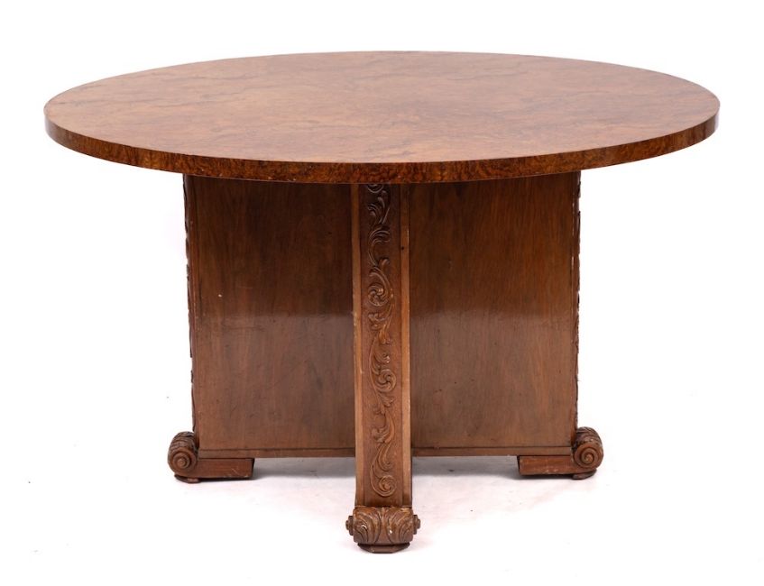 A burr walnut and walnut circular dining table, circa 1930,: the cruciform base with scrolling foliate carved reliefs to the outer fascias, above scrolled acanthus feet; 78cm high, 130cm diameter