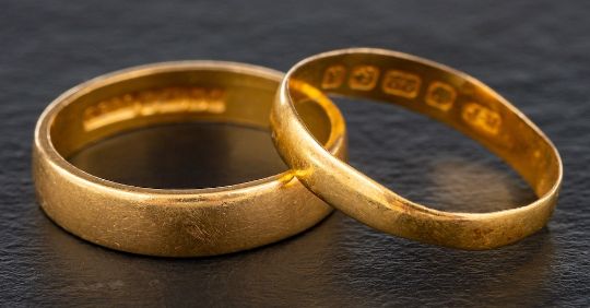 Two 22ct gold band rings,: both with hallmarks for Birmingham, one, 1984, ring size L; the other, 1849, ring size K, total weight ca. 4.9gms.