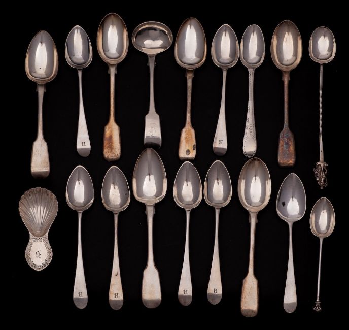 A Victorian provincial silver Fiddle pattern sauce ladle, maker John Stone, Exeter, 1845: initialled, together with assorted teaspoons, caddy spoon etc , various makers and dates, total weight of silver 295gms, 9.51ozs.