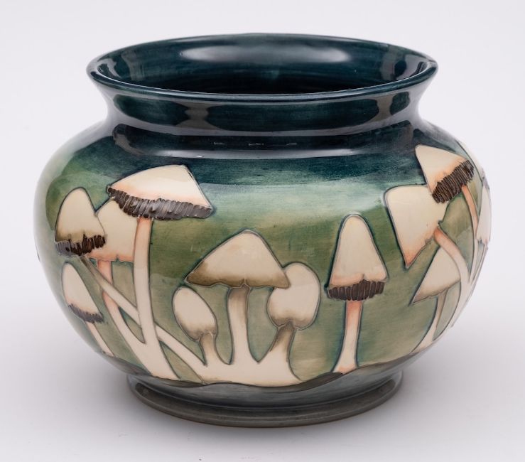 A Moorcroft pottery jardiniere: tube lined after an original by Philip Richardson in the Fairy Rings pattern reserved on a graduating green ground, impressed Moorcroft Made in England with date code for 1991, painted initials, 21cm high.