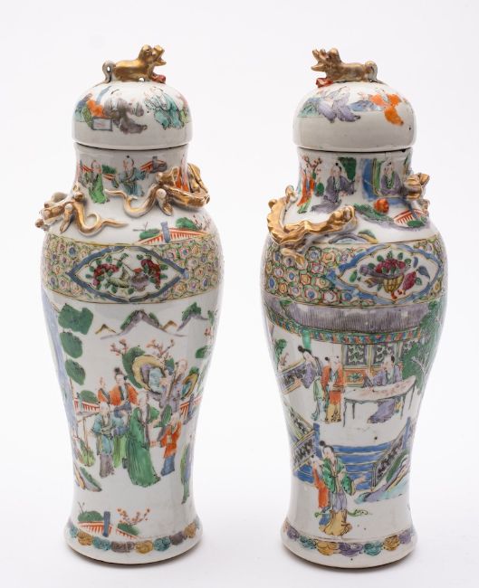 A pair of Chinese famille verte vases and covers: of baluster form with domed covers and lion-dog finials, two gilt chilong applied around each neck and enamelled with a terrace presentation scene, late Qing, 33cm [one with faint hair cracks to rim, the other with chip and glue repair to rim].