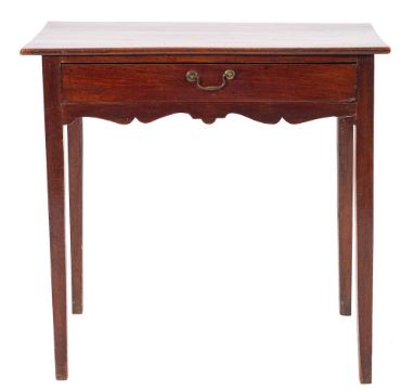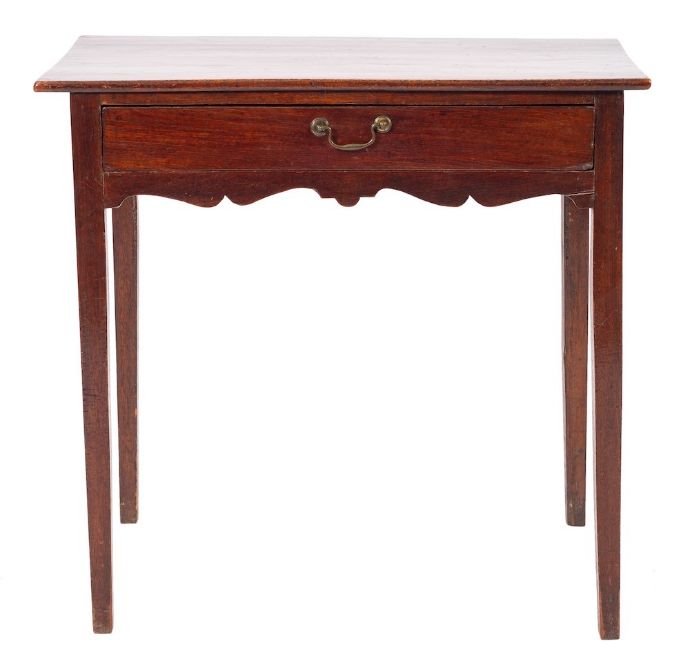 A George II mahogany side table, mid 18th century,: the rectangular top above a frieze drawer with brass swing handle, on straight square section tapered legs; 74cm high, 77cm wide, 43cm deep* The property of the Late Ann Meyrick