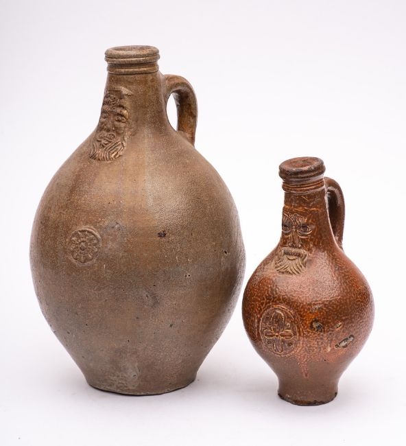 A large 17th century German stoneware Bellamine jug and one other: of traditional form with bearded mask to the neck and foliate medallion below, 33cm [minor chips/glaze losses to footrim]; the smaller jug covered in a deep brown glaze, large bearded mask to the neck and flowerhead medallion below, 23cm [chips/glaze loss to footrim, minor firing faults to body] 2.