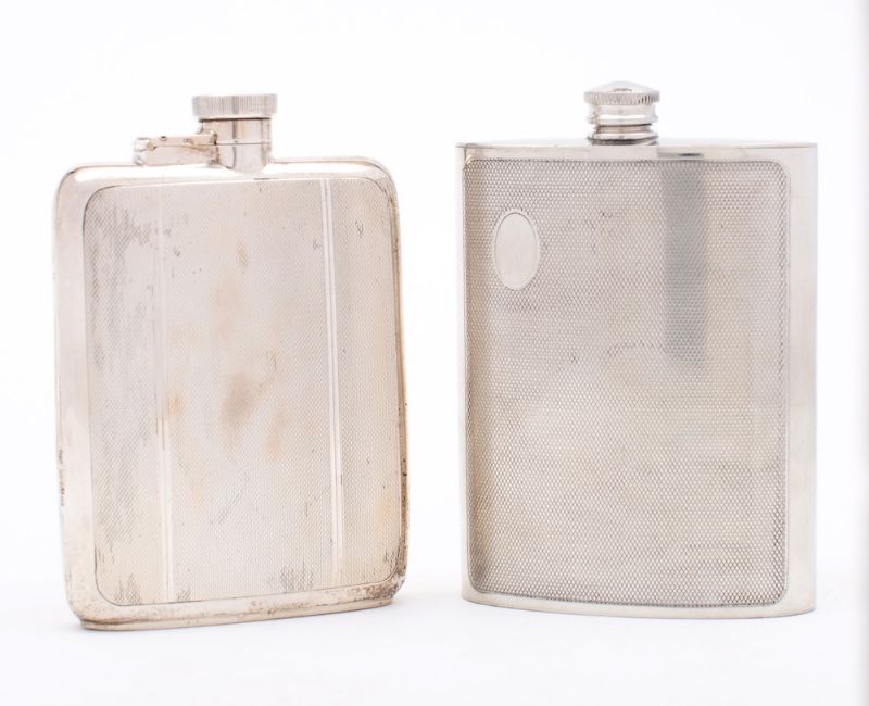 A George V silver hip flask, maker William Neale & Son Ltd, Birmingham, 1925: of rectangular outline having engine turned decoration, 13.5cm long and a pewter hip flask, weighable silver 156gms, 5.04ozs