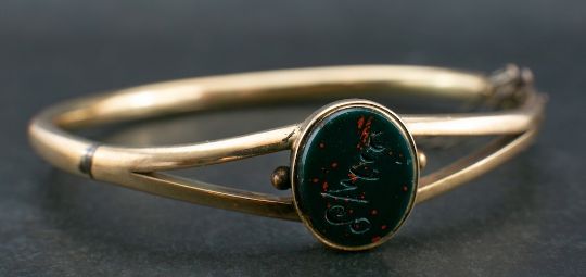 A Victorian, 18ct gold, bloodstone seal, hinged bangle bangle,: the seal engraved with name 'Ellie', inscription to verso 'April 28th 1885', inner diameter ca. 5.8cm, total weight (incl. safety chain) ca. 11gms.