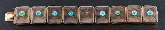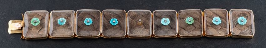 A 15ct gold, Georgian memorial bracelet,: each glass locket panel containing a plait of hair of the children of Sir James (1782-1850) and Lady Caroline Bathurst, surmounted by a blue enamel forget-me-not and rose-cut diamond, inscribed with respective initials to verso, length ca. 18cm, total weight ca. 60gms accompanied by conforming silhouettes of the children and original, fitted, leather case.