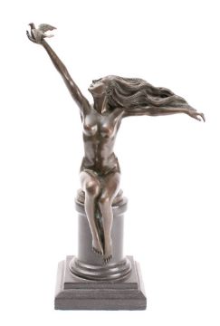 After Amedeo Gennarelli , 'The Carrier Pigeon' an Art Deco influence bronze of a seated nude female with outstretched arms holding a pigeon, raised on a polished marble base, signed to the bronze A. Gennarelli, numbered A7303, bears Paris foundry mark, overall height 43cm high.