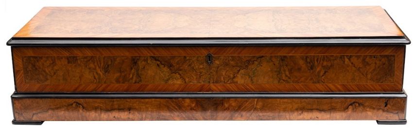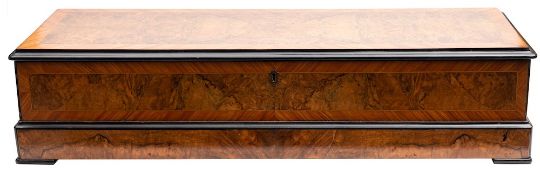 WITHDRAWNNicole Freres, Geneva, a large late 19th century musical box: playing eight airs, serial No 52610, gamme No 5255, with ratchet wind double drum and 38.5cm interchangeable cylinder, tune indicator and speed regulator contained in a figured walnut and tulip wood inlaid case, 97cm wide, together with an additional cylinder.