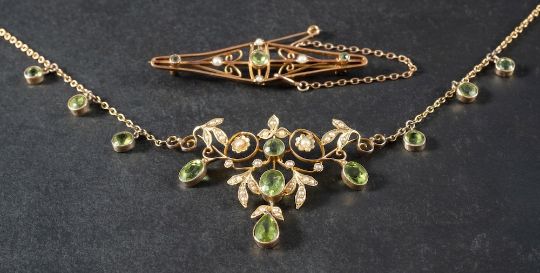 A peridot and seed pearl Art Nouveau style fringe necklace,: stamped '9C', length ca. 51cm; together with an openwork peridot and seed pearl brooch, length ca. 5.5cm, total weight ca. 13.2gms.