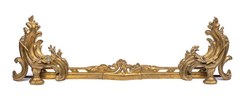 A 19th century gilt metal adjustable fire kerb in Louis XV style: with sliding adjustable foliate and scroll chenets to the pierced front rail, 100cm retracted.