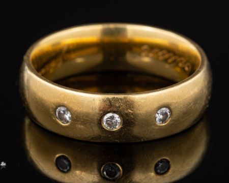 An 18 carat gold and diamond ring,: the polished band set with three brilliant cut diamonds, stamped 750 with Birmingham hallmarks, ring size O 1/2, 8.2g.