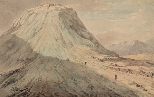 English School 19th Century-A mountain top fortification; figures in the foreground,:-watercolour, 23 x 36cm, unframed.