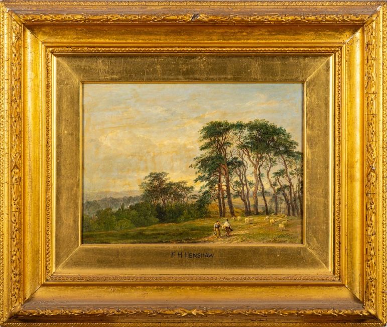 Frederick Henry Henshaw [1807-1891]-Rural clearing with figures and sheep,:-signed and dated 1841 bottom rightoil on canvas, 25 x 35cm.
