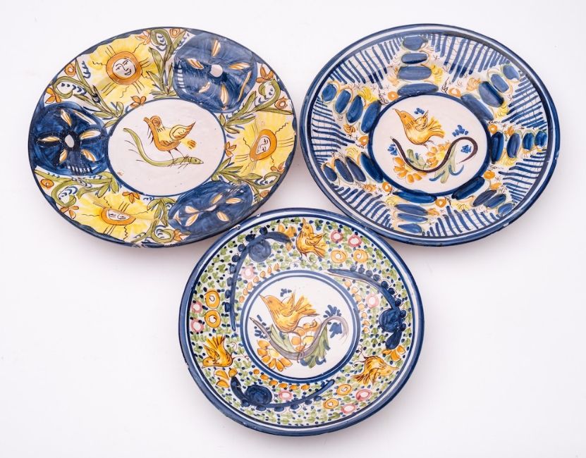 A Puente Arzobispo faience deep bowl: painted in green, yellow and black with a leaping goat in a landscape, together with three other faience dishes each decorated with a central bird.[4]