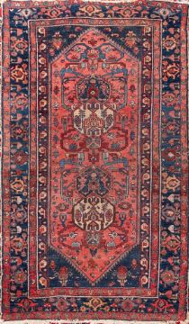 A Hamadan rug:, the rose hexagonal field with serrated ends, geometric designs and indigo spandrels, enclosed by a main indigo palmette medallion border, 183cm x 109cm.