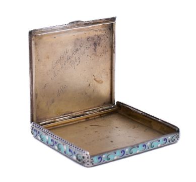 A Continental silver and enamelled case, bears Latvian import marks: inscribed to the interior, of rectangular outline, the hinged lid with plain panel and enamelled border, with floral enamel decoration to the sides and backs, 8cm wide.