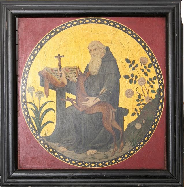 A 19th Century painted wood panel: depicting St Giles and the Hind, seated in front of a bible and holding a crucifix, contained in an ebonised frame, 28.5 x 28.5cm.
