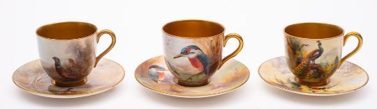 A group of six Royal Worcester porcelain coffee cups and saucers: three painted with pheasants, kingfishers and a peacock by Jas.Stinton, R.Austin and J.F.Lexman respectively, together with a set of three painted with pink roses by M.Hunt [one saucer with interior crack], all with puce printed factory marks [12].