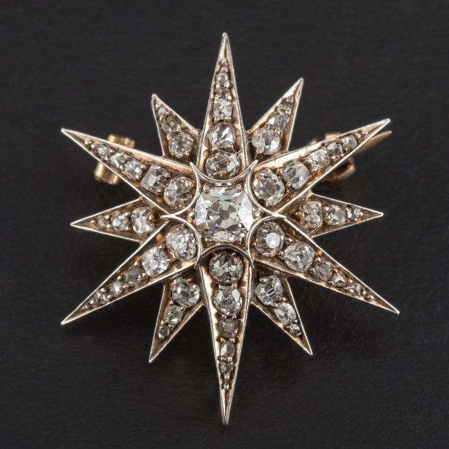 A Victorian, gold and silver, old-cut diamond star brooch,: total estimated diamond weight ca. 1ct, I-J colour, SI1-2 clarity, diameter ca. 3.3cm, total weight ca. 6.1gms.