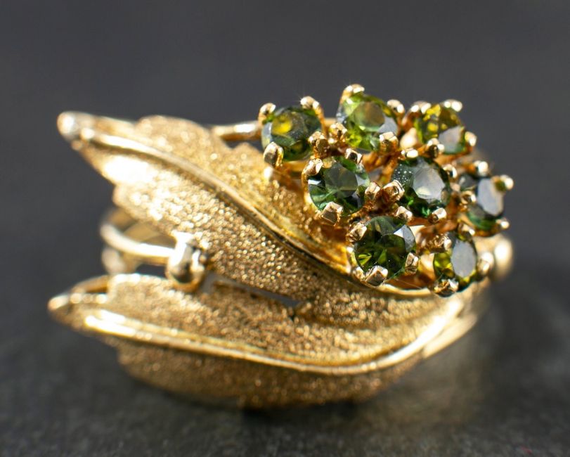 An andalusite ring of stylised foliate design,: stamped '750', length of ring head 2.3cm, ring size P, total weight ca. 5.6gms.