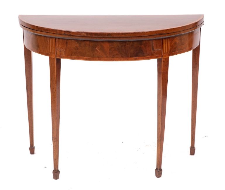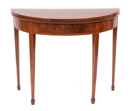 A George III mahogany and crossbanded demi-lune card table, late 18th century,: the hinged top opening to a baize lined interior, with plain friezes to marquetry fluting above the straight, tapered legs, to gaitered feet; 73cm high, 90cm wide, 44cm deep (closed)