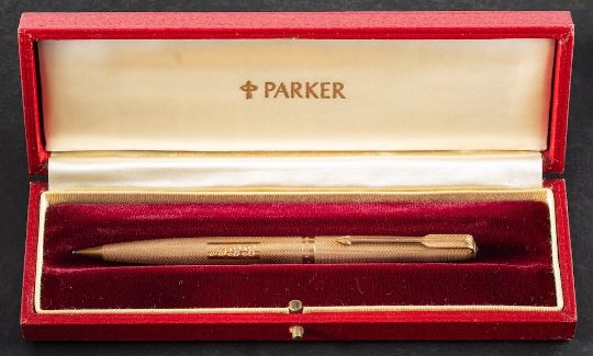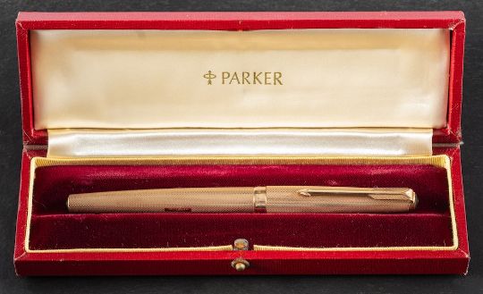 A Parker 9ct gold 'Fine Barley' pattern pen set: comprising Parker 61 fountain pen, propelling pencil and ball point pen, all initialled 'ABB', in original individual boxes with instructions. (3)