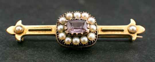 An amethyst and seed pearl bar brooch,: length of brooch ca. 4.6cm, total weight ca. 5.6gms.