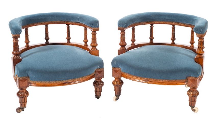 A pair of Victorian mahogany and upholstered low tub armchairs, circa 1870,: the padded hoop toprails on turned spindle supports; with bow fronted seats; the lobed and tapered front leg sand splayed back legs on ceramic castors; 60cm high, 64cm wide; a pair of Edwardian mahogany and blue upholstered tub chairs, early 20th century; and a Victorian carved walnut and green upholstered nursing chair, circa 1865* The property of the Late Ann Meyrick