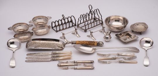 An Edward VII silver six-division toast rack, maker Martin, Hall & Co, Sheffield, 1905: of arched outline with loop carrying handle and raised on ball feet, 13cm long, two pairs of bon bon dishes, butter dish, bowl and ashtray, together with plated flatwares, total weight of silver 446gms, 14.34ozs.