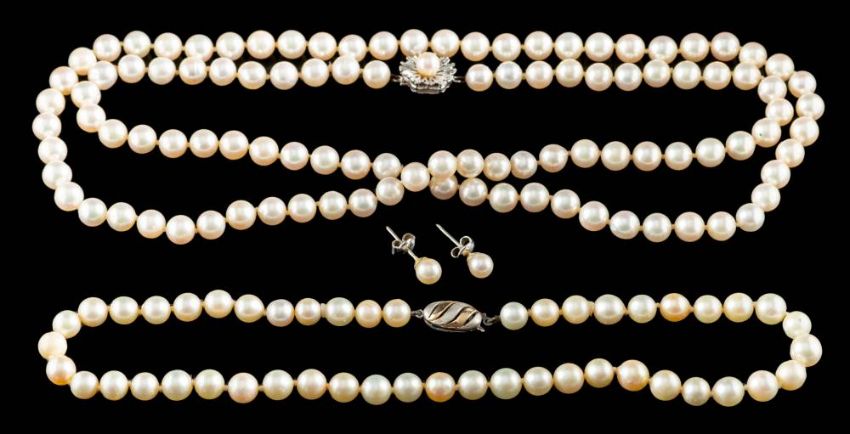 A cultured pearl necklace,: the single strand necklace composed of uniform 7mm cultured pearls, the clasp set with a cultured pearl, stamped 750, 84.5cm long; a cultured pearl choker, 38cm long; and a pair of cultured pearl ear studs.