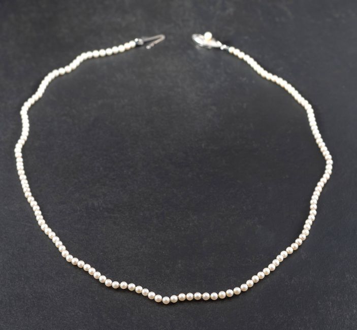 A single row necklace of Mikimoto cultured pearls to a silver clasp,: the cultured pearls of pinkish hue, diameter of cultured pearls, ca. 2.5-2.9mms, clasp stamped 'SILVER', total length ca. 47cm, accompanied by Mikimoto certificate.