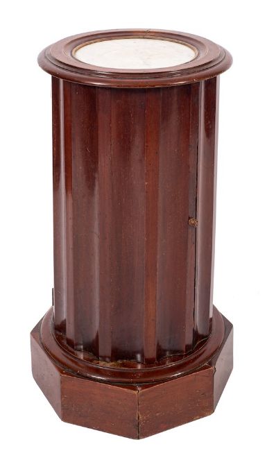 A Victorian mahogany and marble topped pot cupboard, mid 19th century,: of truncated columnar form, the circular top with moulded edges, above fluted sides, a hinged door to the front, on an octagonal base, 72cm high, 38cm diameter; and a George III mahogany and sycamore strung commode, circa 1800, of rectangular form, the fitted interior with china pot, 48cm high, 58cm wide, 47cm deep