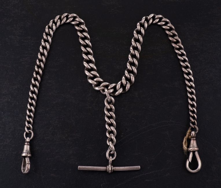 A silver Albert pocket watch chain: curb link marked for silver, with silver bar, overall length 21cm.