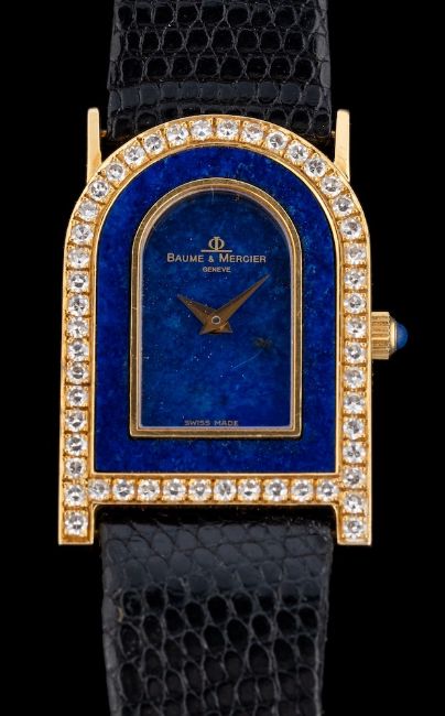 Baume & Mercier, an 18 carat gold lapis lazuli and diamond wristwatch,: numbered 37837 984 360, the lapis lazuli dial with tapered baton hands, within a surround of eight cut diamonds, approximately 1.25 carats total, on a black strap, case 22mm wide.