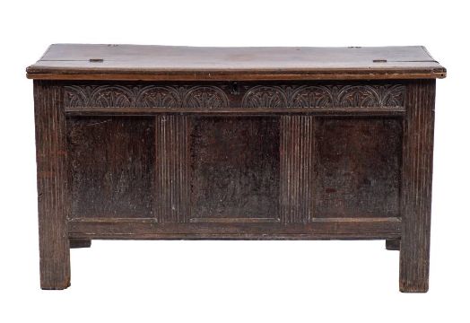 A Jacobean oak coffer, late 17th century and later adapted,: the hinged cover above a frieze of carved arcading, the three panel front flanked by channel moulded through stiles; with conforming sides; 73cm high, 130cm wide, 53cm deep.