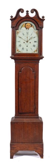 Thomas Ivory, Dundee, a moonphase longcase clock: the eight-day duration movement striking the hours on a bell with the twelve-inch painted break-arch dial having black Roman numerals, a subsidiary seconds dial, date aperture (ring now missing), decorative gilt-brass hands and signed Thos. Ivory, Dundee, with strawberry decoration to the four corners, the arch having a moonphase disc painted with land and seascapes, the falseplate to the dial embossed to the rear with the name of the well-known dialmaker Wilson, Birmingham, the oak case having quartered pillars and a swan-neck pediment to the hood, all standing on bracket feet, height 202cm.* Biography Thomas Ivory is recorded as working in Dundee from circa 1793 until after 1825 having been made a Burgess of the city in July 1795. He was the son of the well-known maker James Ivory.*Notes Reference Donald Whyte Clockmakers & Watchmakers of Scotland Pub. Mayfield Books 2005