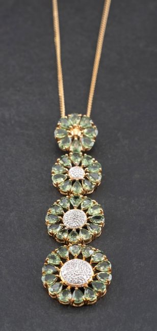 A prasolite and diamond pendant of graduated stylised flowerhead design,: length ca. 7.7cm, together with a 9ct gold curb-link chain, length ca. 45.5cm, total weight ca. 12.5gms.