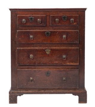 An early George III oak chest of drawers, circa 1765,: the cleated top with moulded edges, above two short and three graduated long drawers, all with twin metal ring handles, on bracket feet; 98cm high, 80cm wide, 48cm deep