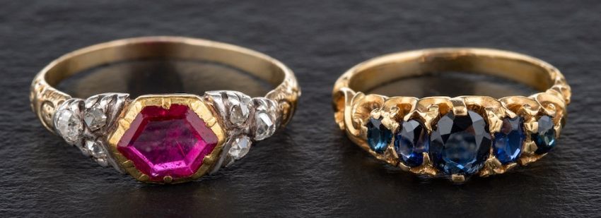 A synthetic sapphire five stone ring and a synthetic ruby and single-cut diamond ring,: total estimated diamond weight ca. 0.10cts, ring size K-R, length of ring head ca. 1.5-1.8cms, total weight ca. 5.7gms. (2)