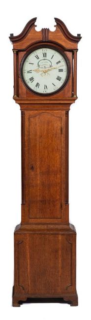 Fletcher, Barnsley, an oak longcase clock: the thirty-hour duration movement striking the hours on a bell, with the thirteen-inch round painted dial having black Roman numerals, date aperture and signed Fletcher, Barnsley, with brass hands, the oak case having quartered columns, the hood with a swan-neck pediment and brass capitals to the pillars, the base with raised mouldings and standing on bracket feet, height 208cm.*Biography There are three members of the well-known Fletcher family working in Barnsley, Yorkshire at this period with the maker of this clock quite probably one of the two clockmaking sons of Tobias Fletcher, either Charles born circa 1780 or Tobias II born 1782.*Notes Reference Brian Loomes Yorkshire Clockmakers Pub. Daleman Books 1972