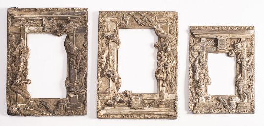 Three Chinese antimony frames: with low relief decoration of dragons entwined around temple gates, 24 x 18cm and 20 x 15cm. (3).