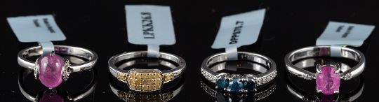 An emerald and diamond ring,: set with five oval cut emeralds, with eight cut diamond accents, stamped 925, ring size R; together with seven further gem set rings.